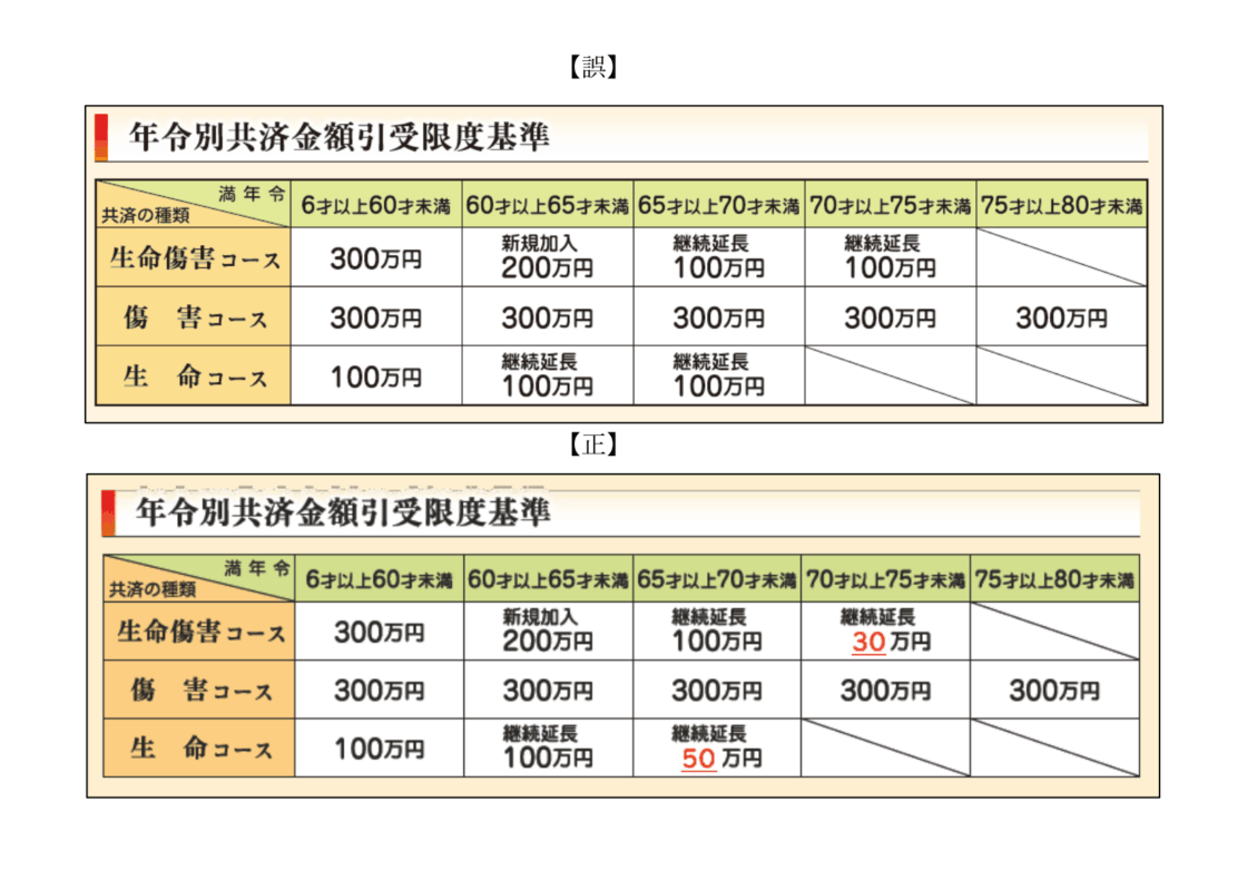 該当箇所につきましては、正しい内容へ修正したパンフレットを公開しております。(生命傷害共済パンフレット(修正版)のページはこちら)